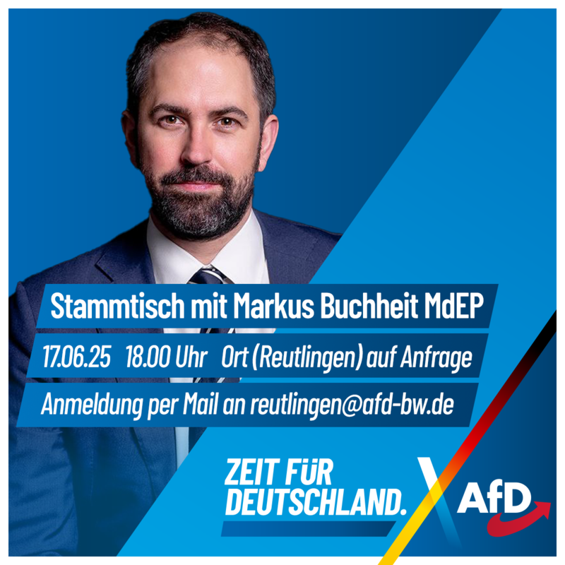 Einladung zum Stammtisch des AfD-Kreisverbands Reutlingen Der AfD-Kreisverband Reutlingen lädt Sie herzlich zu einem Stammtisch mit Markus Buchheit, Mitglied desÂ...