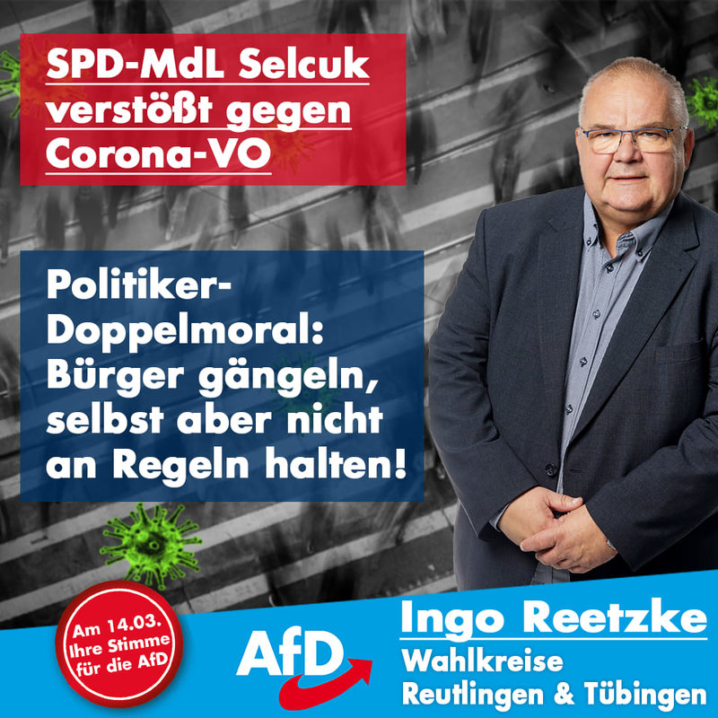 Verstoß gegen Corona-Verordnung: AfD-Landtagskandidat Reetzke kritisiert „Doppelmoral“ des SPD-Abgeordneten Selcuk
