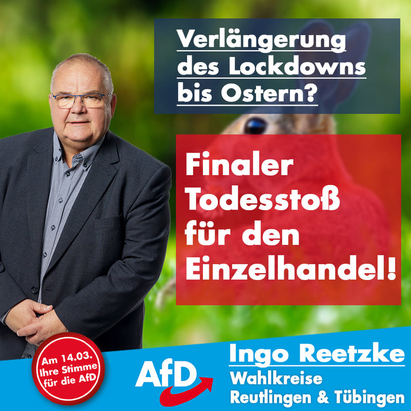 Reutlingen/Tübingen, 12.01.2021. Der Kandidat der AfD in den Landtagswahlkreisen Reutlingen und Tübingen, Ingo Reetzke, lehnt die Forderungen nach einer Verlängerung des Lockdowns bis Ostern strikt ab. „Das wäre der finale Todesstoß für den Einzelhandel, die Gastronomie und viele weitere B...