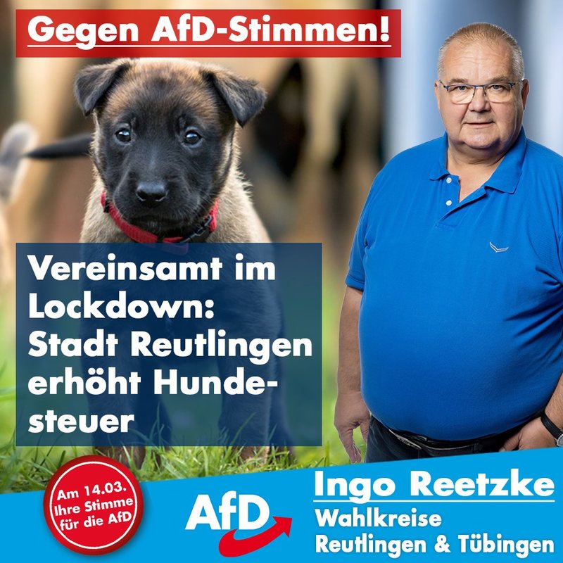 Reutlingen, 16.12.2020. Der Reutlinger Gemeinderat hat am Dienstagabend eine Erhöhung der Hundesteuer um bis zu 25 Prozent beschlossen – gegen die Stimmen der Fraktion der Alternative für Deutschland (AfD). Deren stellvertretender Fraktionsvorsitzender Ingo Reetzke begründet die Ablehnung auch...