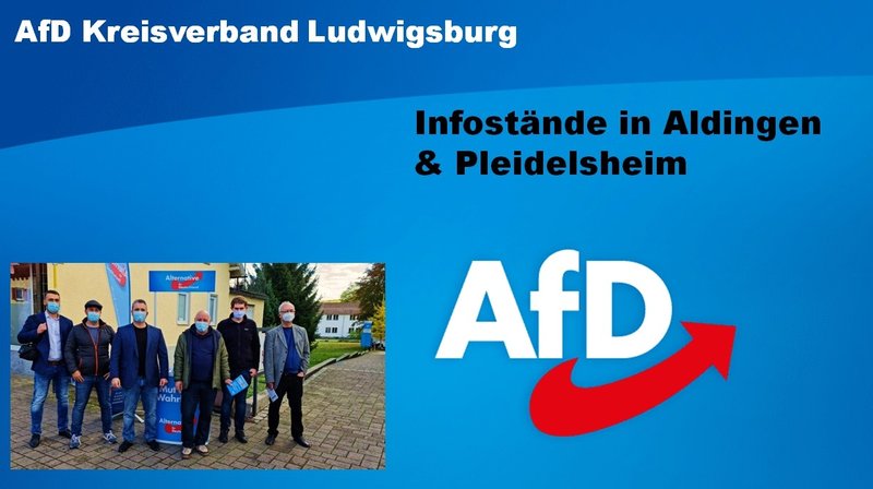 Am 24. Oktober 2020 war es wieder soweit. Der Kreisverband Ludwigsburg brach auf, um den Bürgern von Aldingen und Pleidelsheim die Standpunkte der Alternative für Deutschland näher zu bringen.  Nachdem schon die vergangenen Infostände in vielen Gemeinden unseres schönen Landkreises gezeigt h...