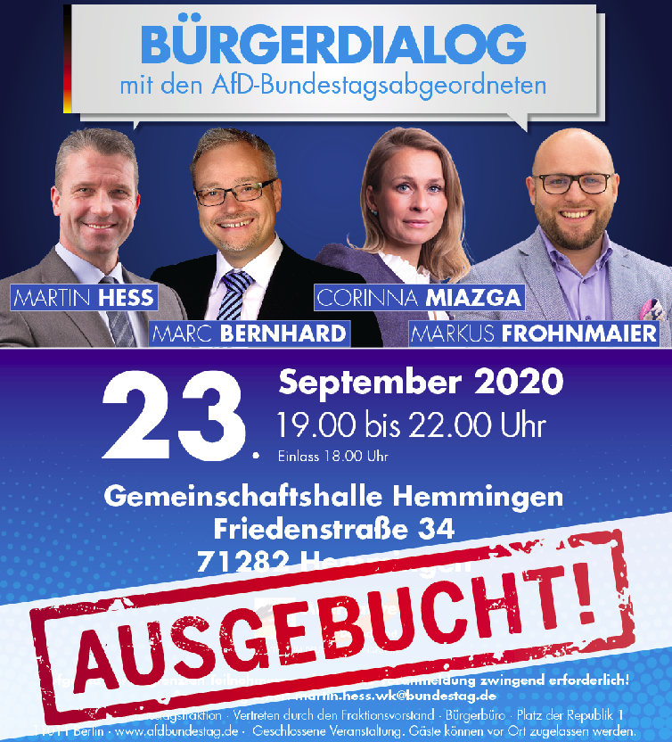 Am 23. September 2020 findet ab 19:00 Uhr (Einlass 18:00 Uhr) in der Geminschaftshalle Hemmingen der AfD - Bürgerdialog mit den Bundestagsabgeordneten Martin Hess, Marc Bernhard, Corinna Miazga und Markus Frohnmaier unter dem Motto "Neue Perspektiven für unser Land" statt. Die Themen werden sein:...