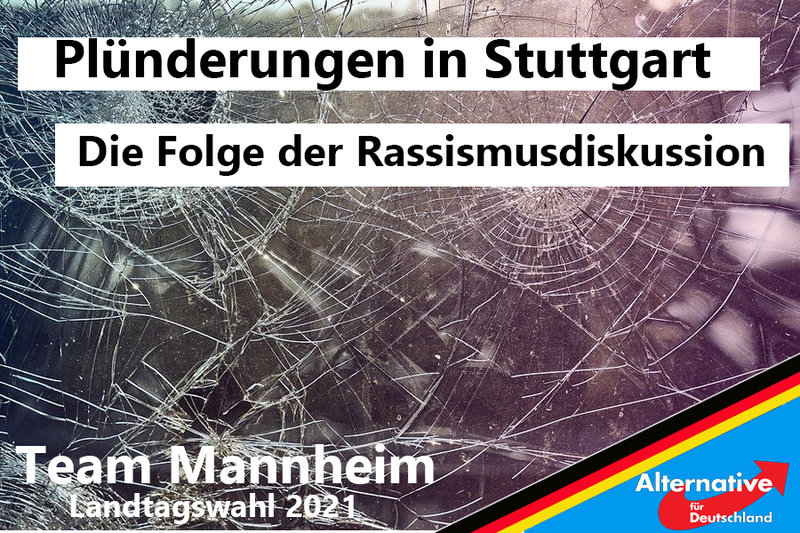Nach mehreren Pressemeldungen verwüsteten hunderte Randalierer die Stuttgarter Innenstadt. Geschäfte wurden systematisch geplündert. Bilder und Berichte belegen, dass fast ausschließlich junge Männer, potentielle Migranten unter den Plünderern waren.  Potentiell, weil, man sich bei dem AusmaÃ...