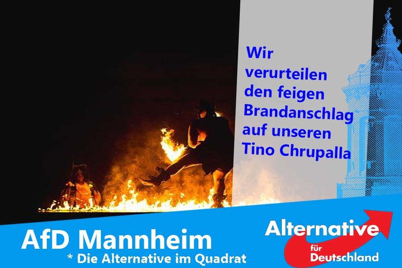 Das Auto des unseres Bundesvorsitzenden Tino Chrupalla ist von Unbekannten abgefackelt worden. Ein Übergreifen des Brandes auf das Anwesen von Chrupalla ist nur aufgrund seines beherzten Eingreifens verhindert worden. Bei diesem Rettungseinsatz wurde Chrupalla verletzt.  Es hätte auch Tote geben ...