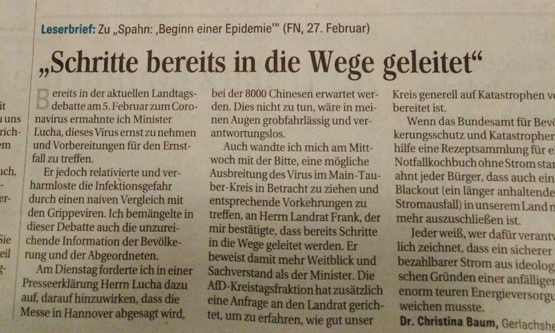 Leserbrief der Landtragsabgeordneten Dr. Baum zum Krisenmanagement im Zuge der Coronavirus-Pandemie.