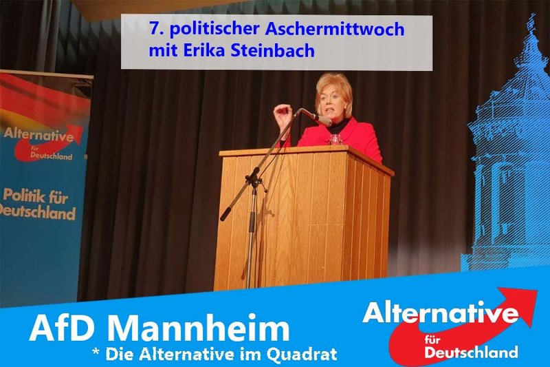 Aufgrund der aktuellen Bedrohungslage von AfD Amts und Mandatsträgern hatte sich der Kreisverband Mannheim entschieden, den 7. Politischen Aschermittwoch mit Erika Steinbach als geschlossene Veranstaltung für Mitglieder zu organisieren. Bereits im Vorfeld zeigte sich, dass diese Maßnahme richtig ...