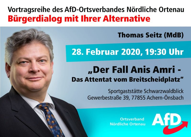 Der Ortsverband Nördliche Ortenau der Alternative für Deutschland lädt recht herzlich alle Interessierten, Freunde und Mitglieder der AfD zu einem offenen Stammtisch ein. Vortrag von MdB Thomas Seitz "Bürgerdialog mit Alternative" des OV Nördliche Ortenau - Sportgaststätte "Schwarzwaldblick...