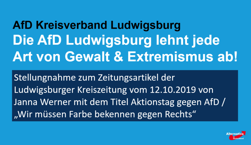 Stellungnahme zum Zeitungsartikel der Ludwigsburger Kreiszeitung vom 12.10.2019 von Janna Werner mit dem Titel Aktionstag gegen AfD / „Wir müssen Farbe bekennen gegen Rechts“ Für die AfD als Rechtsstaatspartei ist es eine Selbstverständlichkeit, dass sie links-, rechts- und islamistischen Ex...