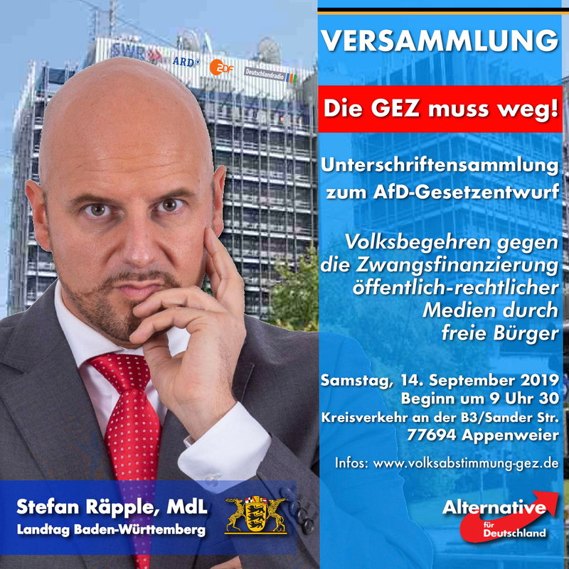 "Weg mit der GEZ" - Samstag 14.9. in Appenweier!   Gemeinsam mit unserem Ortsverbands-Sprecher und Landtagsabgeordneten Stefan Räpple - dem Initiator der GEZ-Gesetzesinitiative - versammeln wir uns am Samstag, dem 14. September 2019 ab 9 Uhr 30 am Kreisel der B3 und der Sander Str. - beim...