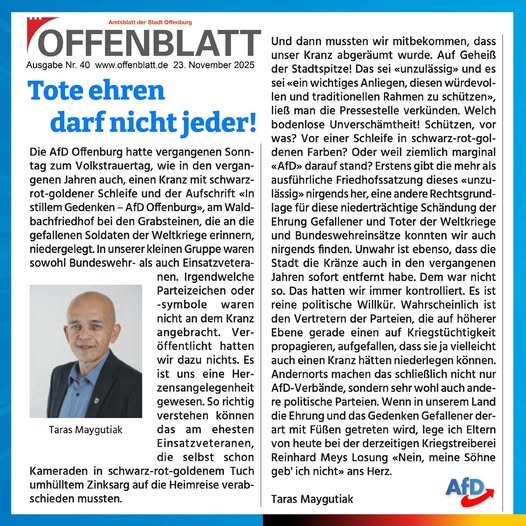 Die AfD Offenburg hatte vergangenen Sonntag zum Volkstrauertag, wie in den vergangenen Jahren auch, einen Kranz mit schwarz-rot-goldener Schleife und der Aufschrift...