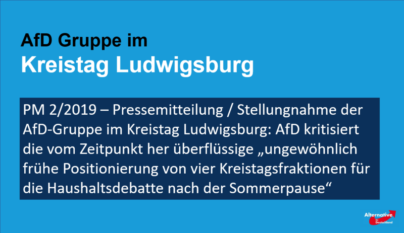 PM 2/2019 – Pressemitteilung / Stellungnahme der AfD-Gruppe im Kreistag Ludwigsburg: AfD kritisiert die vom Zeitpunkt her überflüssige „ungewöhnlich frühe Positionierung von vier Kreistagsfraktionen für die Haushaltsdebatte nach der Sommerpause“