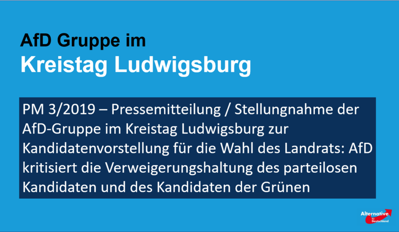 PM 3/2019 – Pressemitteilung / Stellungnahme der AfD-Gruppe im Kreistag Ludwigsburg zur Kandidatenvorstellung für die Wahl des Landrats: AfD kritisiert die Verweigerungshaltung des parteilosen Kandidaten und des Kandidaten der Grünen