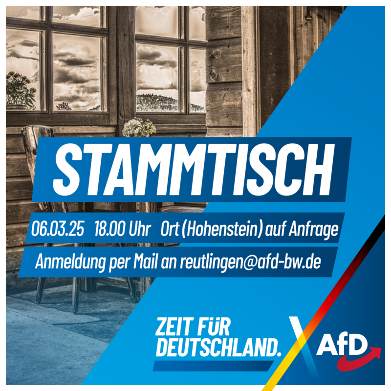 Einladung zum Stammtisch des AfD-Kreisverbands Reutlingen Der AfD-Kreisverband Reutlingen lädt Sie herzlich zu einem Stammtisch mit Joachim Steyer, Mitglied des ...
