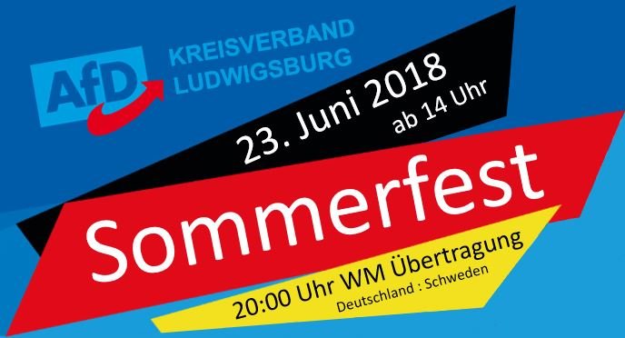 Am Samstag, 23.06.2018 fand das Sommerfest des AfD Kreisverbandes Ludwigsburg statt. Die ca. 120 Gäste hatten Grund zu feiern, denn die AfD wirkt! Dies macht sich auch in den aktuellen Umfragewerten bemerkbar. Diese stiegen seit der Bundestagswahl um 4 Prozentpunkt auf nun 16 %. Wenn das so weit...