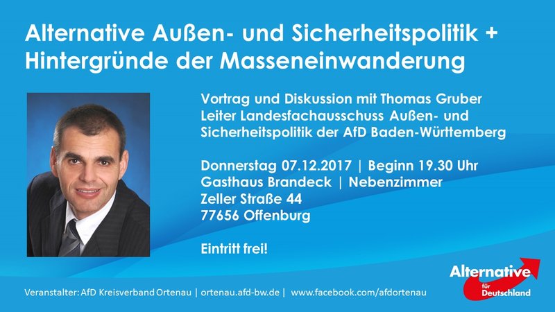 Der Kreisvorstand Ortenau der Alternative für Deutschland lädt recht herzlich alle Interessierte, Freunde und Mitglieder der AfD zu einem Vortrag mit Thomas Gruber ein. Der Referent ist Leiter des Landesfachausschusses Außen- und Sicherheitspolitik der AfD Baden-Württemberg. Schwerpunkt des Vort...
