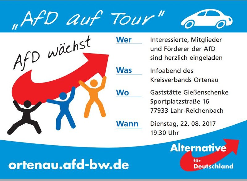 Lahr-Reichenbach. Der Kreisvorstand der Alternativen für Deutschland tourt durch die Ortenau. Herzlich eingeladen sind alle Interessierte, Freunde und Mitglieder der AfD zu einem offenen Stammtisch bei Ihnen vor Ort. Lernen Sie die Mitglieder des Vorstands und andere Mitglieder unserer Partei kenne...