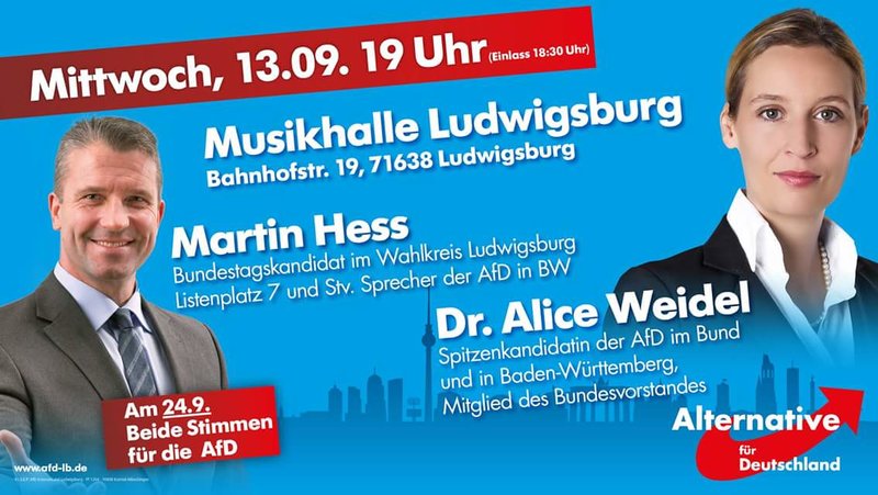Am 13. Septemberg 2017 19:00 Uhr kommen Martin Hess, Bundestags-Direktkandidat im Wahlkreis Ludwigsburg und Stellvertretender Sprecher (Vorsitzender) der AfD in Baden-Württemberg sowie Dr. Alice Weidel, Spitzenkandidatin der AfD und Mitglied des Bundesvorstandes in die Musikhalle Ludwigsburg.\r \r...