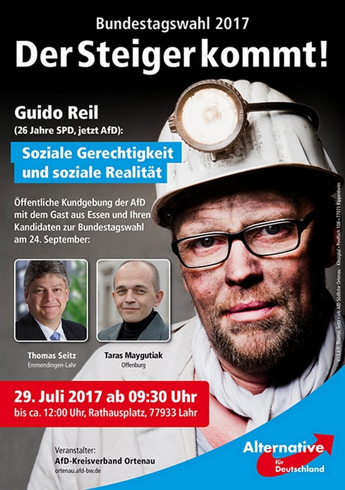 Um 9.30 Uhr werden wir am Samstag dem 29.07.2017 auf dem Rathausplatz in Lahr als Hauptredner Guido Reil begrüßen können. Guido Reil war 26 Jahre in der SPD. Er ist AfD-Landeslistenkandidat,  Gewerkschafter, Betriebsrat und aktiver Steiger. „Hartz-IV verbreitet Angst, sich dem System unterwerf...