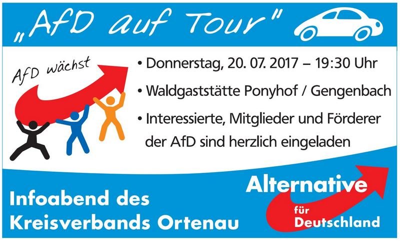 Gengenbach. Der Kreisvorstand der Alternativen für Deutschland tourt durch die Ortenau. Herzlich eingeladen sind alle Interessierte, Freunde und Mitglieder der AfD zu einem offenen Stammtisch bei Ihnen vor Ort. Lernen Sie die Mitglieder des Vorstands und andere Mitglieder unserer Partei kennen. Er...