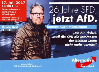 Der prominente ehemalige SPD-Kommunalpolitiker Guido Reil kommt am 17. Juli auf Einladung der AfD in die Zehntscheuer nach Münsingen und referiert dort über seinen Weg von den Sozialdemokraten zur Alternative für Deutschland (AfD). „Guido Reil war 26 Jahre lang Mitglied der SPD und Ratsherr im...