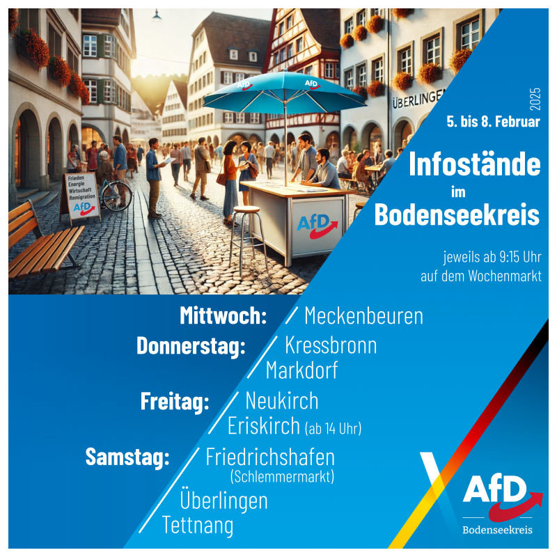 Wir sind in dieser Woche (5. bis 8. Februar) mit unserem Infostand vormittags ab etwa 9:15 Uhr auf den Wochenmärkten im Bodenseekreis, stehen den Passanten für Fr...
