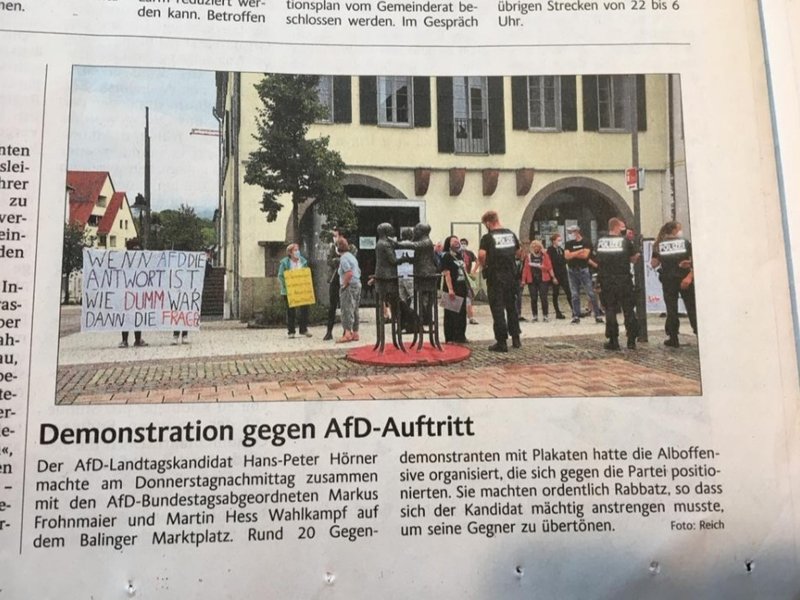In seinem Zeitungsbericht “Demonstration gegen AfD-Auftritt" stellte der Schwarzwälder Bote – wie üblich - die rechtliche Situation total verfälscht dar! De...