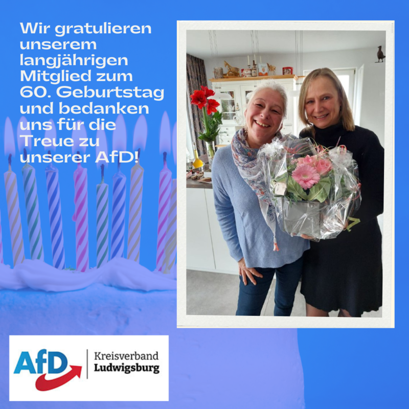 Am 03.12.2024 gratulierte Angelika Stosiek unserem langjährigen Mitglied zum 60. Geburtstag und bedankt sich für ihre Treue zur AfD.