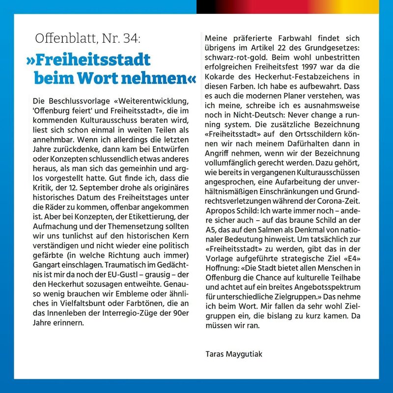 Freiheitsstadt beim Wort nehmen - Taras Maygutiaks Beitrag im Meinungsforum des Offenblatt