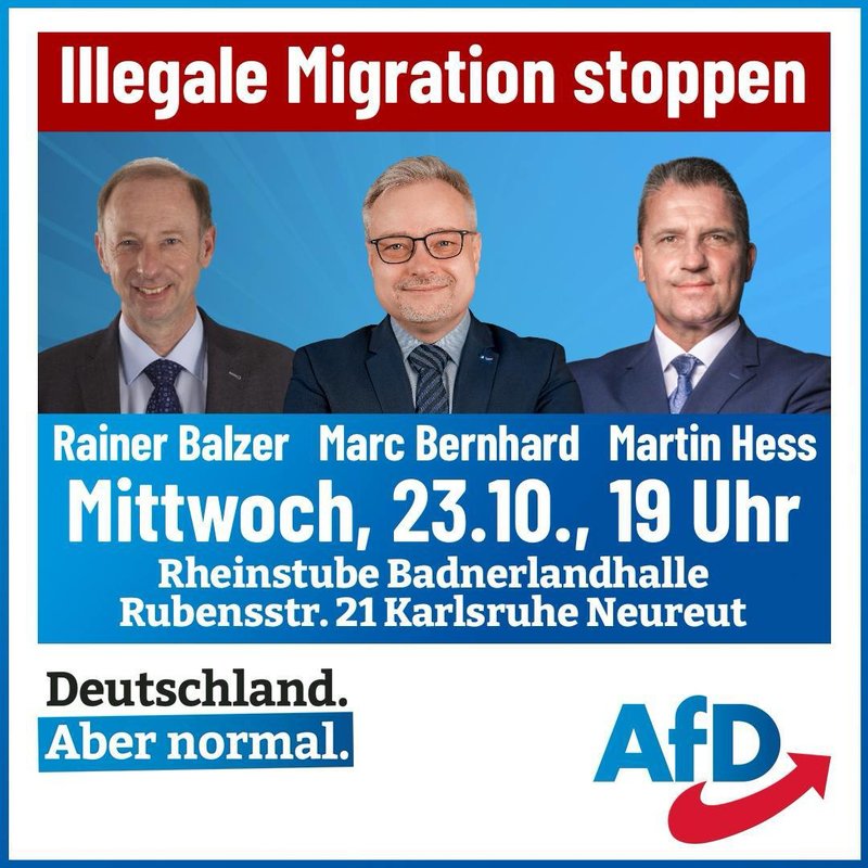 Illegale Migration stoppen! Bürgerdialog mit Rainer Balzer MdL, Marc Mernhard MdB und Martin Hess MdB. Location: Rheinstube Badnerlandhalle, Rubensstr. 21, Karlsr...