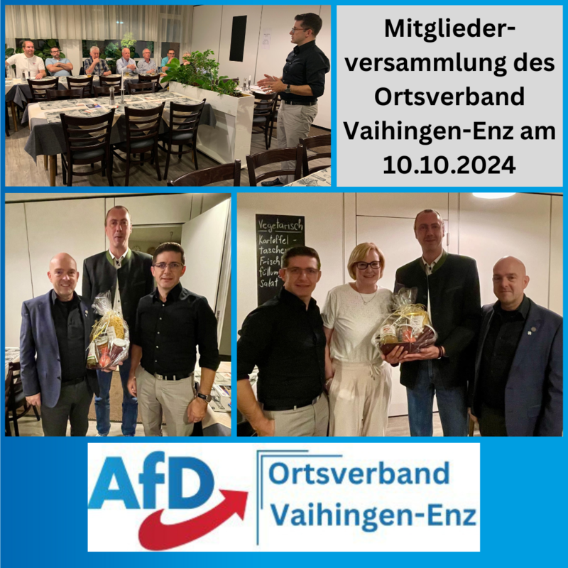 Bei der Mitgliederversammlung des AfD Ortsverbandes Vaihingen Enz und Umgebung am 10.10.2024, wurde von Sprecher Nikolaos Boutakoglou, sowie dem Schriftführer ein ...
