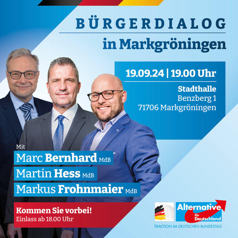 Einladung zum Bürgerdialog der AfD-Franktion im Bundestag mit Marc Bernhard MdB, Martin Hess MdB und Markus Frohnmaier MdB in der Stadthalle in Markgröningen. Da...