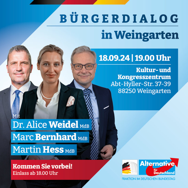 Einladung zum Bürgerdialog der AfD-Franktion im Bundestag mit Dr. Alice Weidel MdB, Martin Hess MdB und Marc Bernhard MdB. Datum: 18.09.2024 Beginn der Veranstal...