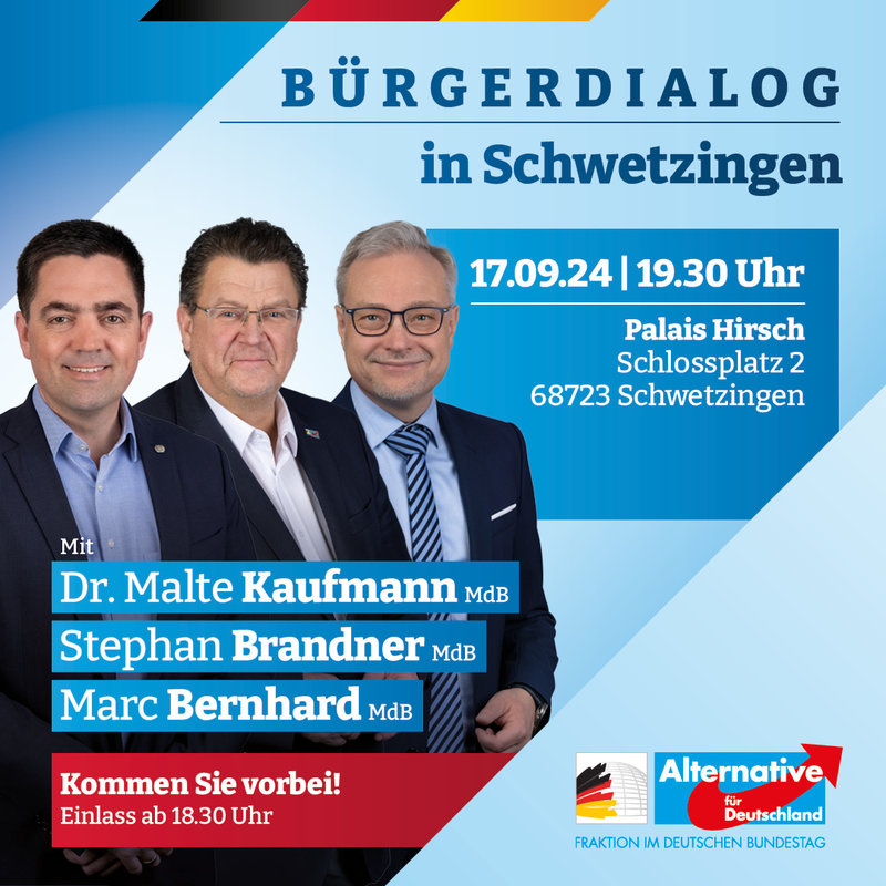 Einladung zum Bürgerdialog der AfD-Franktion im Bundestag mit Dr. Malte Kaufmann MdB, Stephan Brandner MdB und Marc Bernhard MdB im Palais Hirsch in Schwetzingen. ...