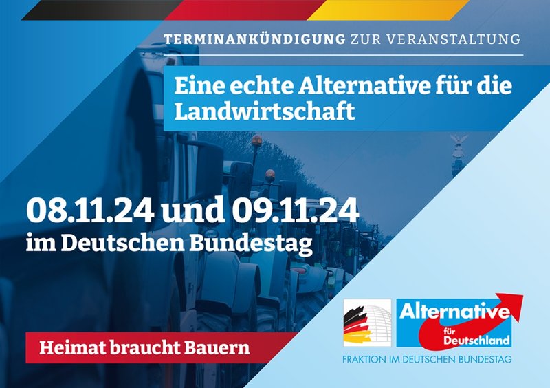 Am 8. und 9.11.2024 veranstaltet die AfD-Fraktion im Deutschen Bundestag ein Symposium zur Landwirtschaft und Agrarpolitik in Berlin. Hier anmelden!