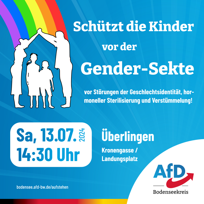 AUF DIE STRAßE! Kundgebung am Sa, 13.07.2024 um 14:30 Uhr in Überlingen auf der Kronengasse am Landungsplatz zum Schutz der Kinder vor der Gender-Sekte. Kommt a...