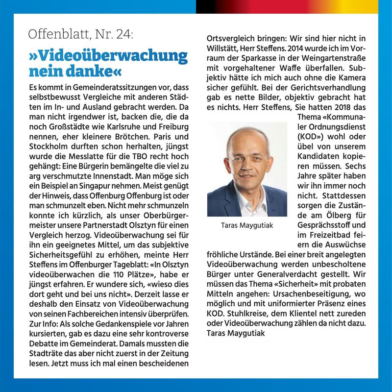 Videoüberwachung? Nein, danke! Taras Maygutiaks Beitrag im Meinungsforum des Offenblatt