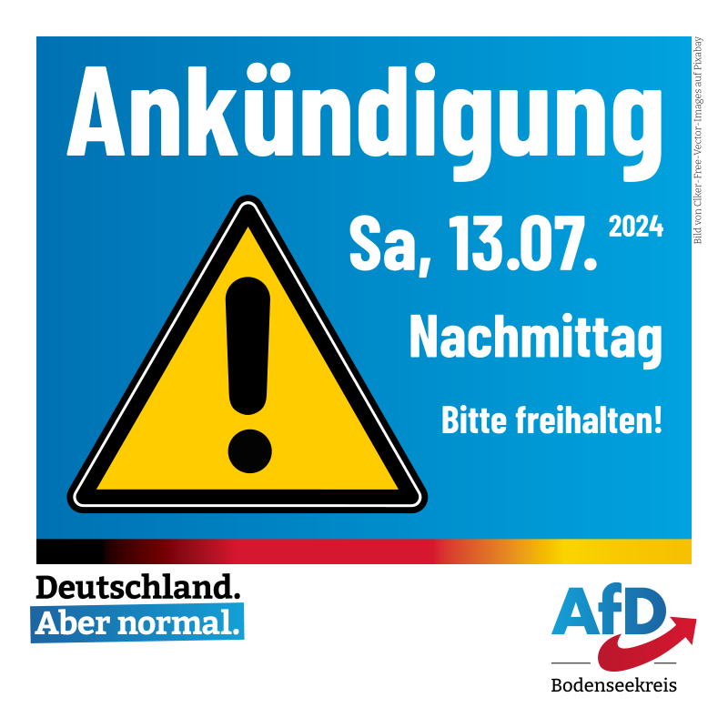 Ankündigung: Bitte den Samstagnachmittag, 13. Juli 2024 freihalten für eine Veranstaltung der AfD Bodensee!