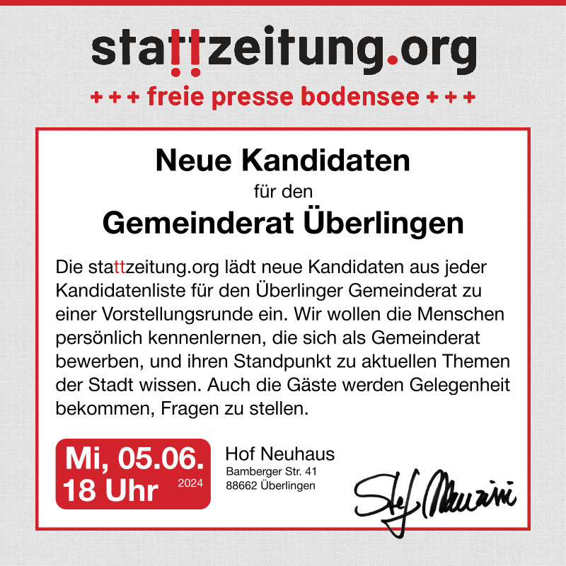 Die AfD-Kandidaten für den Überlinger Gemeinderat haben die Einladung von Stef Manzini von der stattzeitung.org zu einer Vorstellungsrunde gerne angenommen und fr...
