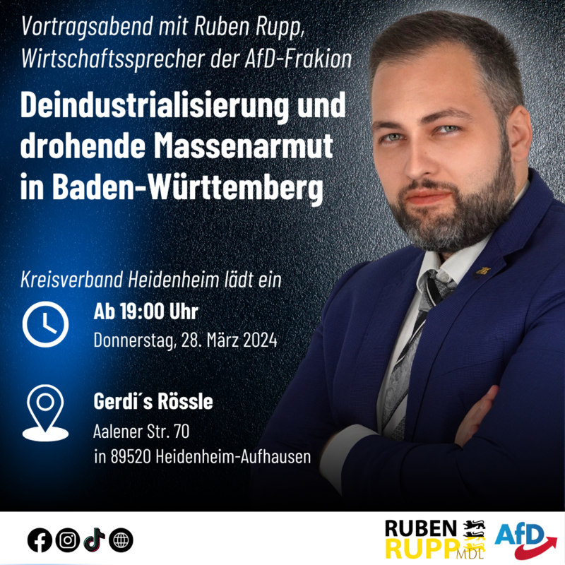 "Deindustrialisierung und drohende Massenarmut in Baden-Württemberg" Der AfD Kreisverband Heidenheim lädt herzlich ein, zu einem Vortragsabend mit dem Landtagsabg...