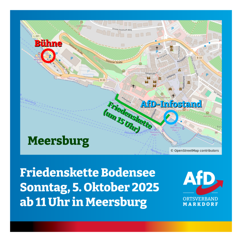 Als einzige im Bundestag vertretene Friedenspartei stehen wir am Sonntag, den 5. Oktober 2025 ab 11 Uhr mit einem AfD-Infostand zum Thema Frieden am Hafen im Osten der Meersburger Altstadt. Wir fordern ganz konkret: Keine Waffenlieferungen in Kriegsgebiete! Um 15 Uhr schließt sich die Menschenke...