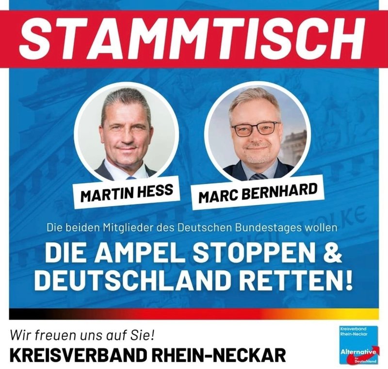 Am 21.11.3023 hattte der AfD-Kreisverband Rhein Neckar eingeladen zum Stammtisch in Dossenheim. Der Abend stand unter dem Thema "Die Ampel stoppen und Deutschland r...
